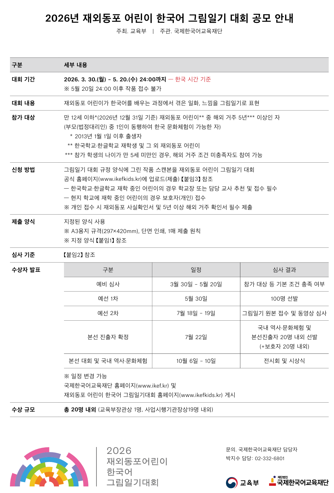 교육부와 국제한국어교육재단에서 2026년 재외동포 어린이 한국어 그림일기 대회를 개최하오니, 재외동포 여러분의 많은 관심과 참여를 부탁드립니다. (본선 진출자 20명과 보호자 20명은 한국 역사·문화 체험 프로그램 참여 가능)